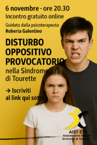 Con questo incontro, guidato dalla dott.ssa Roberta Galentino, psicoterapeuta esperta in Sindrome di Tourette, A.I.S.T. Ets intende offrire uno spazio di confronto e condivisione per genitori e professionisti per imparare a gestire queste situazioni con maggior consapevolezza.