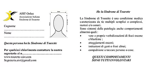 E’ un documento che può essere custodito nel portafoglio, riporta i dati della persona e la diagnosi di Sindrome di Tourette.